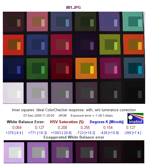 Средняя строчка цифр показывает нам численную оценку ошибки баланса белого в единицах цветового пространства HSV. Так, цифры красного цвета обозначают ошибку по координате S — saturation (насыщенность), цифры синего цвета — в градусах Кельвина [Миредах (Mireds)]. При значении S < 0,02 (речь идет об ошибке по координате S в HSV), ошибка практически незаметна, а при ошибке S > 0,10 она видна, особенно на нейтральных полях большой яркости.