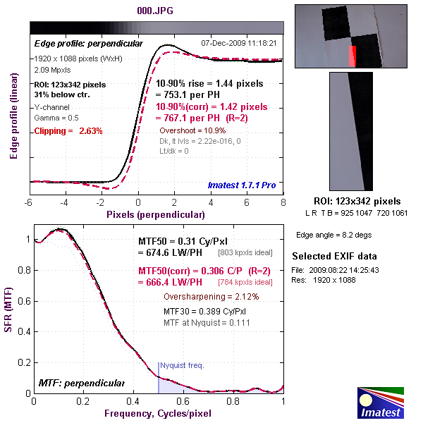 Верхний график представляет собой краевой профиль, для которого приведено значение 10-90% rise distance в пикселях, а нижний график представляет собой MTF (Modular Transfer Function — функция передачи модуляции), для которой приведен параметр MTF50 в циклах на пиксель. Краевой профиль и MTF камеры показаны черной линией. Красной пунктирной линией обозначен краевой профиль и MTF, которые программа Imatest считает близкими к оптимальным. 10-90% rise distance и MTF50 также являются расчетными величинами Imatest.