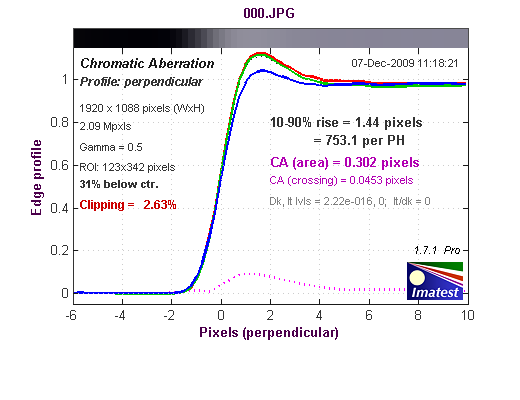 График хроматической аберрации (на самом деле это тот же краевой профиль только построенный по каждому цвету в отдельности). При значении параметра CA (area) равного 0-0,5 хроматическая аберрация не заметна.
