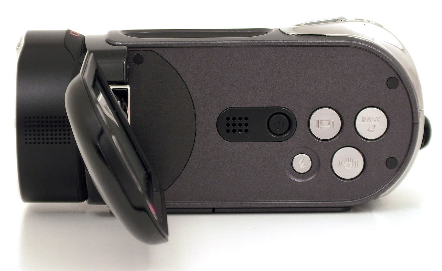 Открыв ЖК-экран, пользователь увидит ещё несколько кнопок: кнопка отключения видеокамеры; кнопка отключения отображения служебной информации на экране; кнопка EasyQ, включающая полностью автоматический режим съёмки; кнопка смены режимов встроенной вспышки; кнопка активации оптического стабилизатора. Здесь же находится и встроенный динамик.