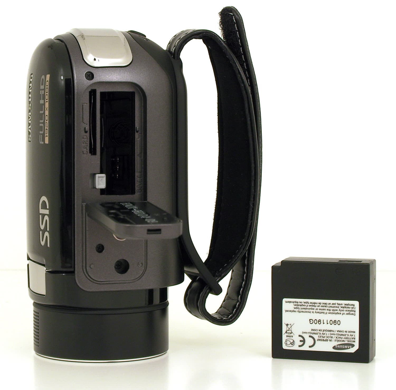 Под отщелкивающейся крышкой в нише видеокамеры находится гнездо аккукумулятора и слот для карты памяти. Прилагаемый к видеокамере 7,4-вольтовый литиево-ионный аккумулятор IA-BP85NF ёмкостью 6,29Wh обеспечивает полуторачасовую работу в режиме записи.