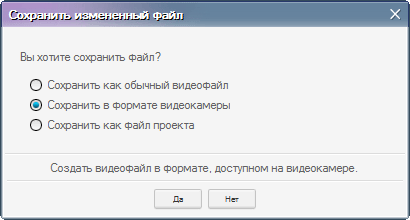 При выборе первой опции (сохранить как обычный видеофайл) сохранение возможно в WMV и MP4 (H.264). Вторая же опция открывает диалоговое окно, где нельзя увидеть тип или формат файла: здесь присутствуют лишь наименования некоторых моделей видеокамер Samsung, да размер кадра.