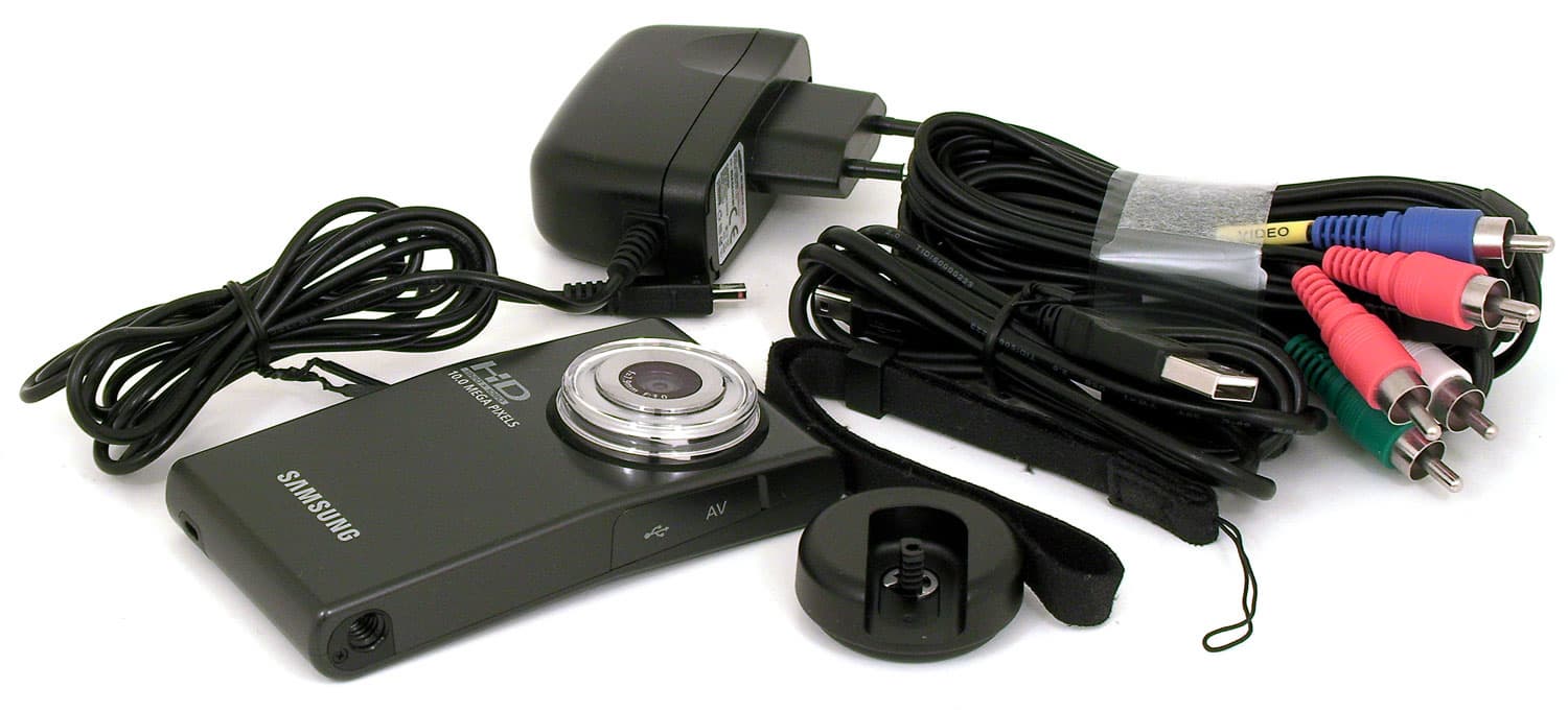 Видеокамера, блок питания, видеошнур (комбинированный композитный и компонентный видеовыходы), USB-кабель, ремешок на руку да специальная заглушка-держатель для крепления аппарата к штативу.