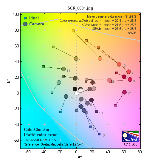 На следующей диаграмме в графической форме представлены отклонения зарегистрированных камерой цветов от идеала в цветовом пространстве CIE LAB. Данная диаграмма отклонения в Lab показывает на сколько камера дает ошибку при передаче цвета.
