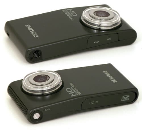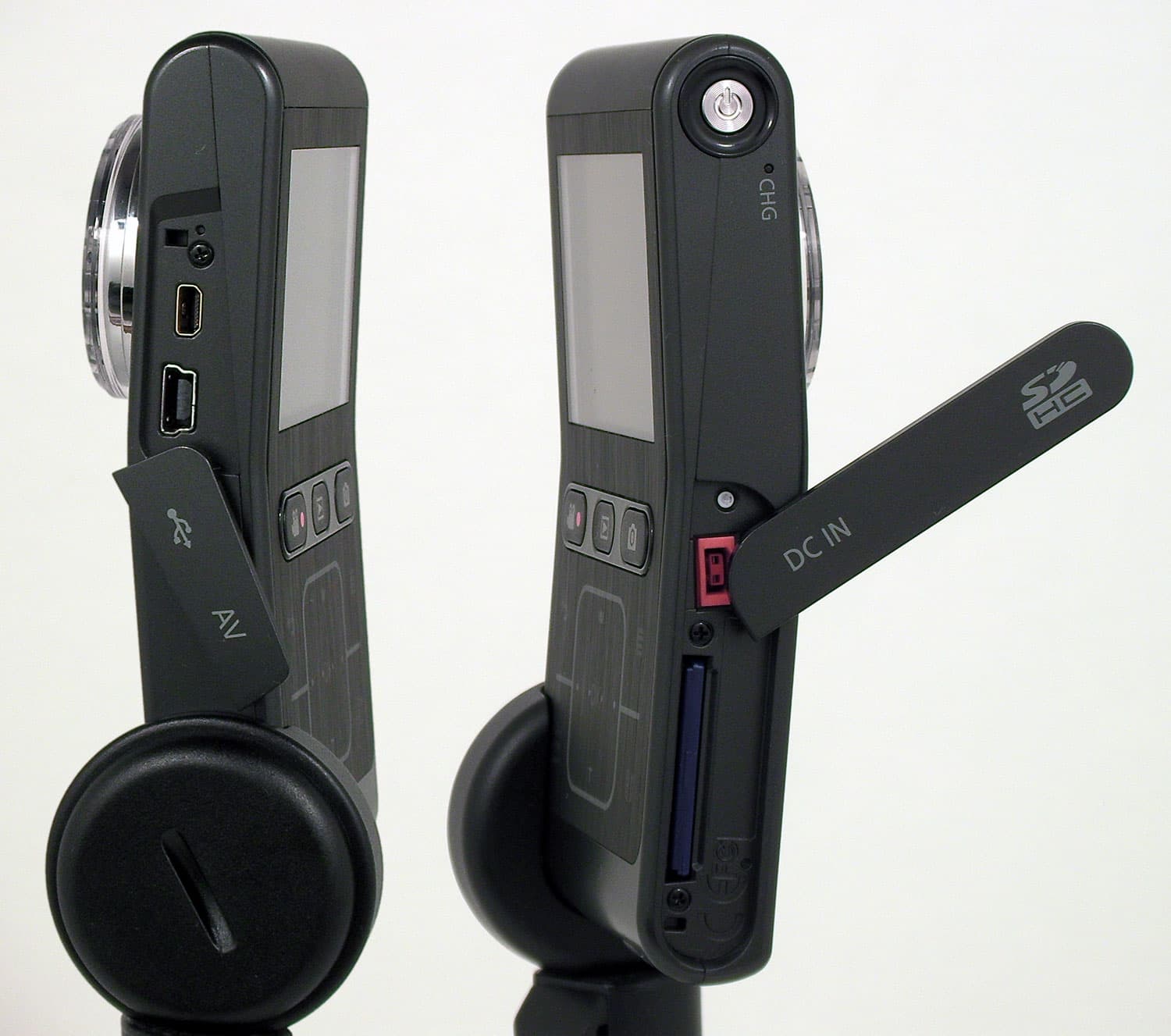 Пластмассовые заглушки с боков корпуса скрывают под собой интерфейсы: видеовыход и USB-порт с одной стороны аппарата; с другой стороны — слот для карты памяти, вход для блока питания и кнопку Reset, нажатие которой перезагружает "зависший" аппарат. Кстати говоря, данная кнопка очень пригодилась: когда в видеокамеру была вставлена обычная SD-карта памяти, аппарат безнадёжно завис и перестал реагировать на любые нажатия. Очухался он лишь тогда, когда его снабдили картой SDHC ёмкостью восемь гигабайт и перезагрузили с помощью данной кнопки.