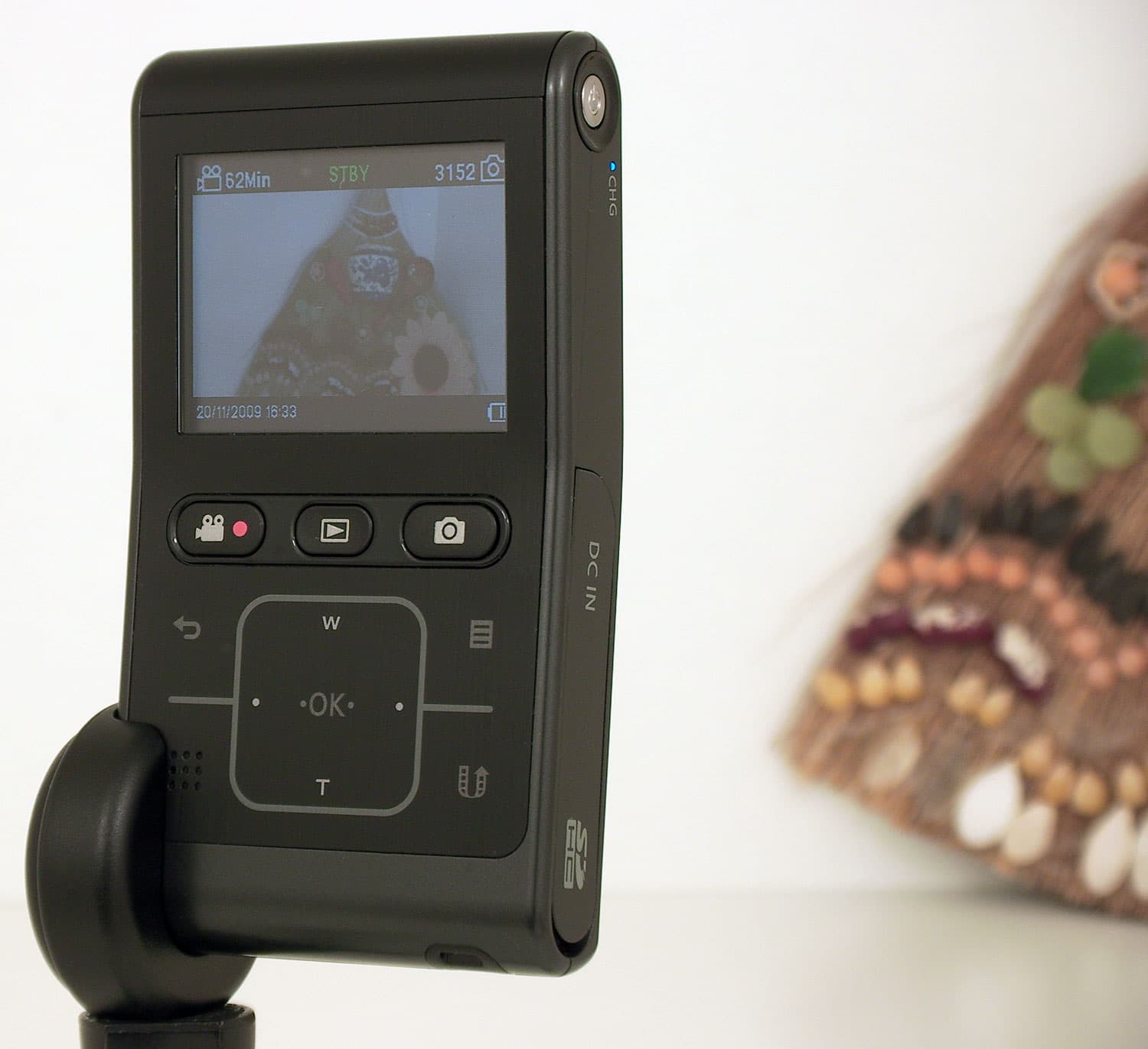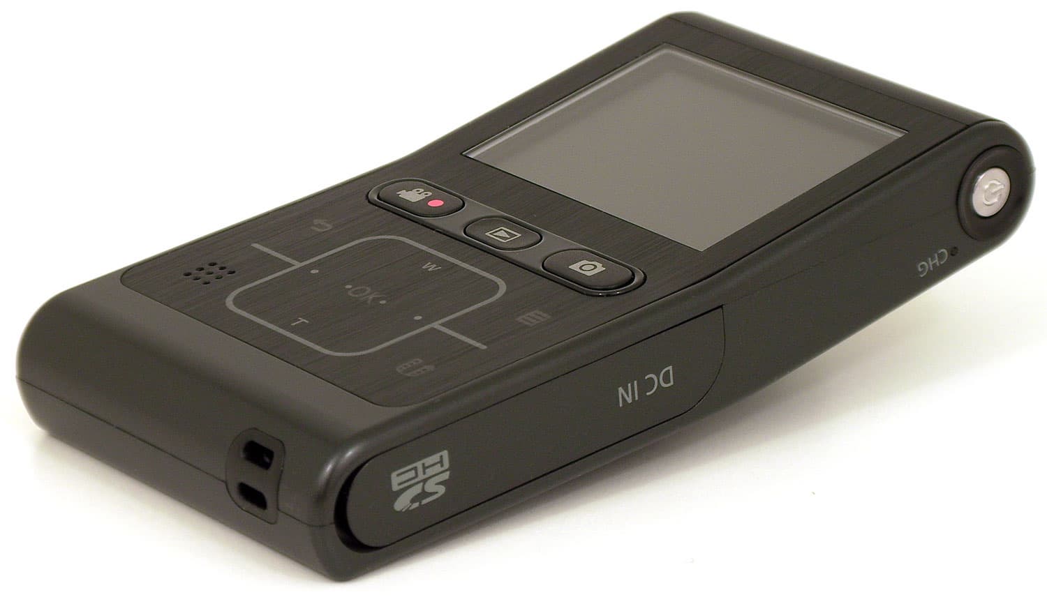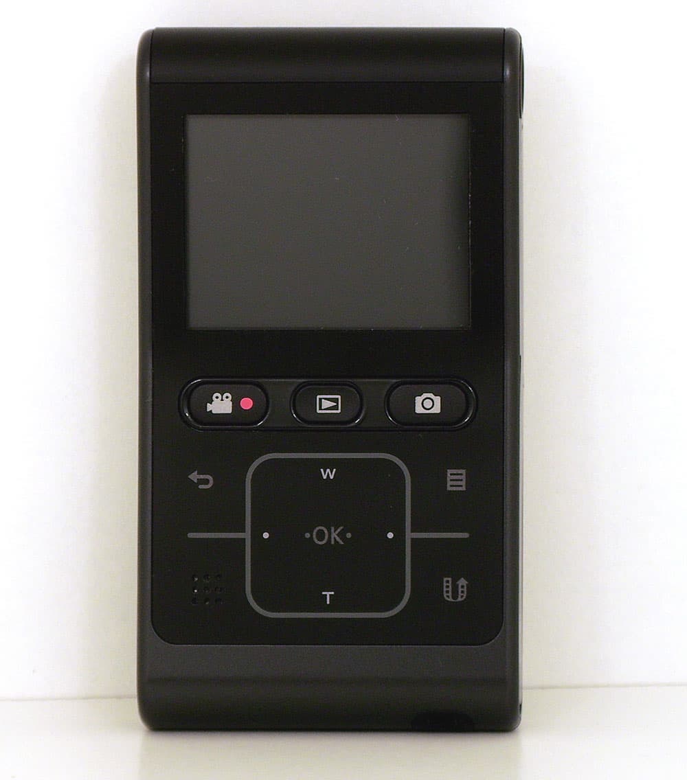 С обратной от объектива стороны расположен двухдюймовый ЖК-экран, три кнопки (запись, воспроизведение, фото) и несколько управляющих кнопок на сенсорной панели. Левый нижний угол этой панели занят динамиком — кстати, на удивление громким.