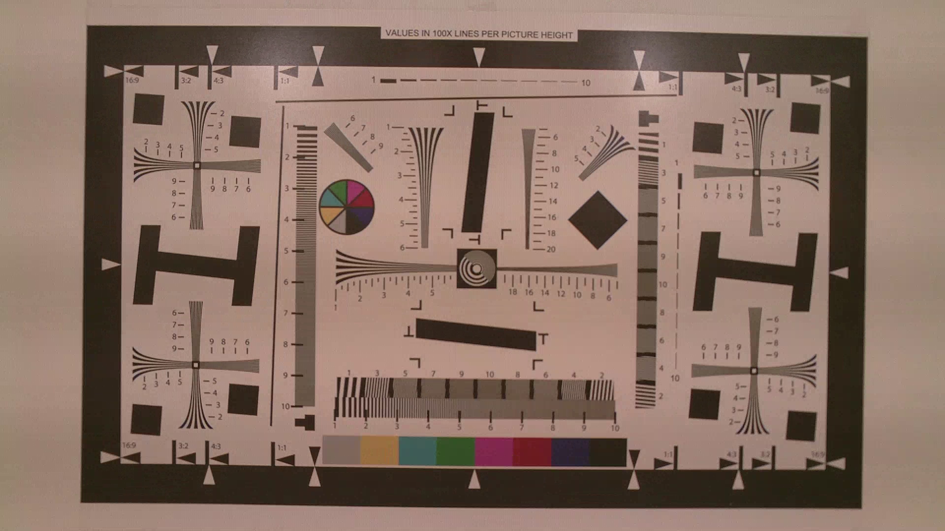 Что касается чёткости получаемого изображения, то тестовой таблицей, как видите, не получилось занять весь кадр. И дело не только в отсутствии у аппарата оптического зума, с помощью которого можно подрегулировать масштаб. Можно возразить: что мешало придвинуть саму видеокамеру к тестовой таблице? Мешало минимальное фокусное расстояние видеокамеры, составляющее 1,3 м (таким образом, данный аппарат не предназначен для макросъёмки). Несмотря на эти ограничения, если внимательно изучить имеющуюся съёмку тестовой таблицы и сделать скидку на её значительное удаление от объектива, можно увидеть неплохой уровень детализации.