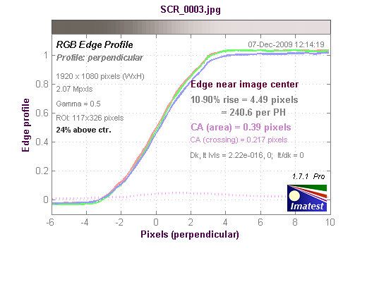 График хроматической аберрации (на самом деле, это тот же краевой профиль, только построенный по каждому цвету в отдельности). При значении параметра CA (area) равным 0-0.5 хроматическая аберрация не заметна.
