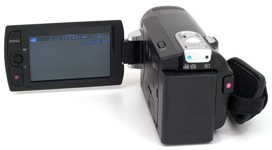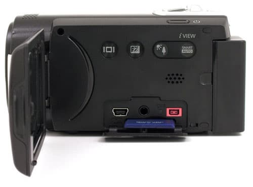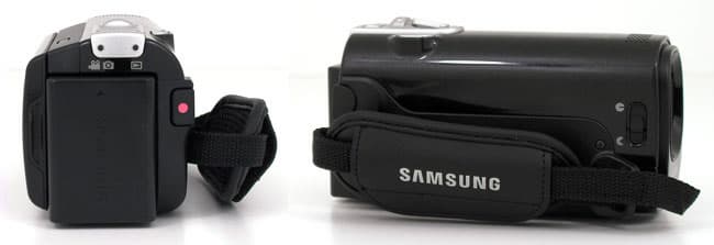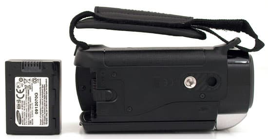 Тип используемого аккумулятора в данной видеокамере также отличается: здесь он сменный, что позволяет приобрести батарею ещё большей ёмкости. Из-за того, что батарея теперь полностью занимает всю заднюю часть аппарата, кнопка записи смещена вбок. На боковой стенке корпуса, рядом с объективом, расположен замок, открывающий защитные шторки объектива. Да, так и есть — объектив здесь открывается и закрывается только вручную.