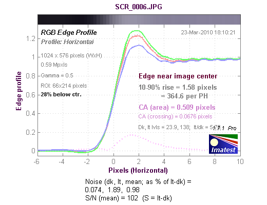 График хроматической аберрации (на самом деле, это тот же краевой профиль, только построенный по каждому цвету в отдельности). При значении параметра CA (area) равным 0-0.5 хроматическая аберрация не заметна.