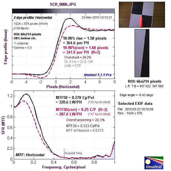 Верхний график представляет собой краевой профиль, для которого приведено значение 10-90% rise distance в пикселях, а нижний график представляет собой MTF (Modular Transfer Function — функция передачи модуляции), для которой приведен параметр MTF50 в циклах на пиксель. Краевой профиль и MTF камеры показаны черной линией. Красной пунктирной линией обозначен краевой профиль и MTF, которые программа Imatest считает близкими к оптимальным. 10-90% rise distance и MTF50 также являются расчетными величинами Imatest.