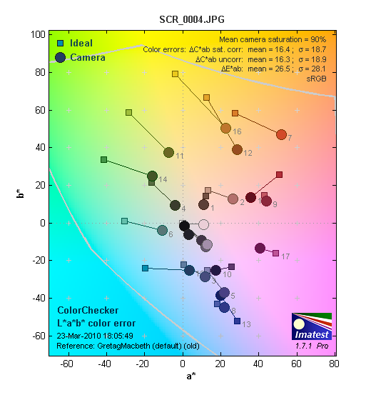 На следующей диаграмме в графической форме представлены отклонения зарегистрированных камерой цветов от идеала в цветовом пространстве CIE LAB. Данная диаграмма отклонения в Lab показывает на сколько камера дает ошибку при передаче цвета.