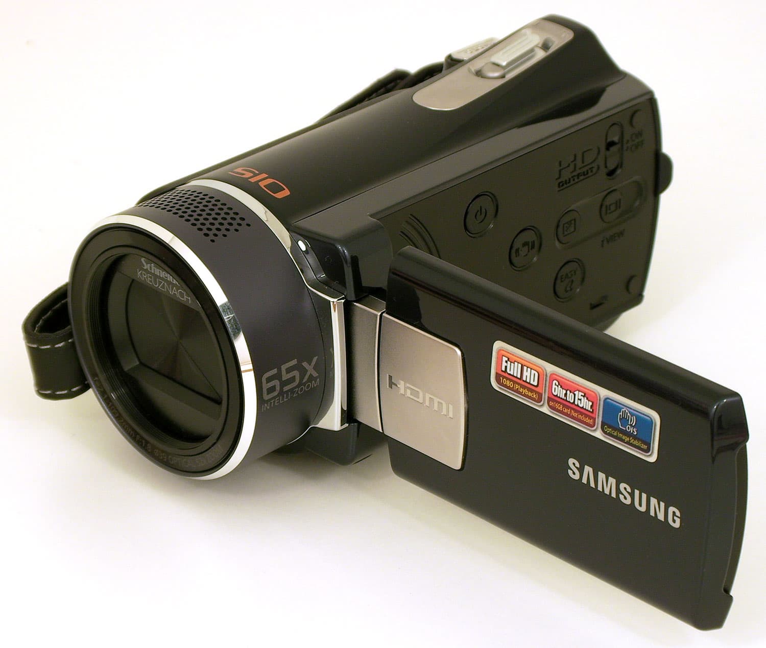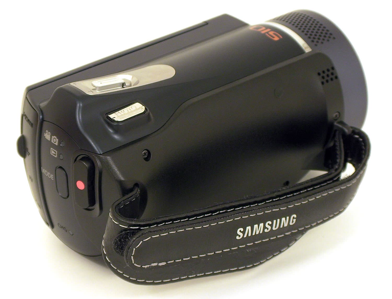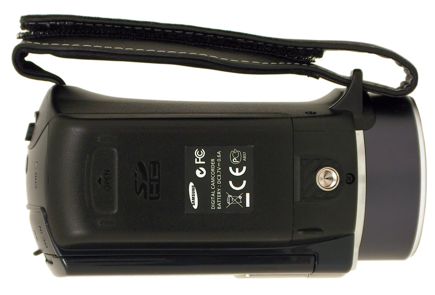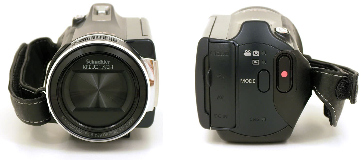 Ремешок, которым оснащена видеокамера, грубоват: искусственная кожа, из которой он сшит, могла бы быть чуть помягче. Над одним из креплений ремешка в пластике корпуса виден ряд отверстий — это встроенный громкоговоритель (динамик). Внутренний стереомикрофон находится под отверстиями в верхней части объектива.