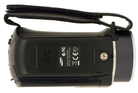 Днище видеокамеры представляет собой сдвигаемую крышку, под которой находится аккумулятор и гнездо для карты памяти. Резьбовое углубление для крепления штатива расположено ближе к объективу, дополнительное углубление без резьбы, помогающее зафиксировать камеру на штативе, отсутствует.