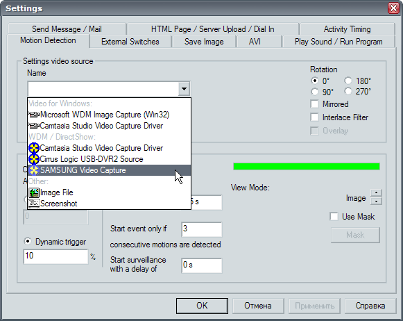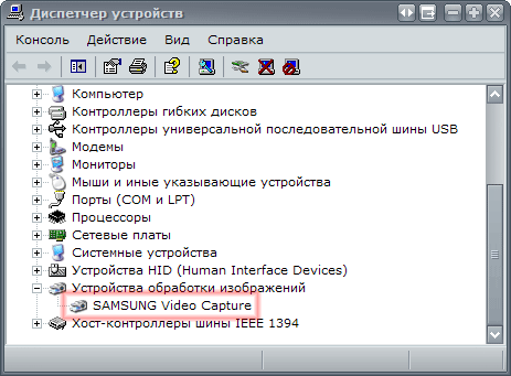 После установки драйверов, прилагающихся к камере, в Диспетчере устройств появится новое устройство SAMSUNG Video Capture. В целях проверки способности героя обзора работать в качестве веб-камеры, была использована программа SupervisionCam. Как видно из рисунка ниже, подключенный к компьютеру по шине USB, работающий в режиме Camera аппарат был отлично распознан "наблюдательной" программой.