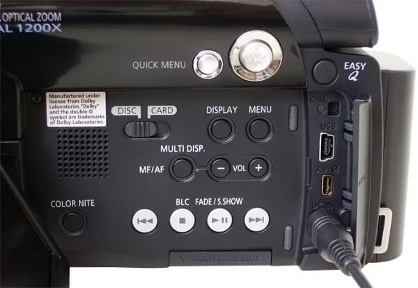 Здесь все достаточно очевидно, хотя и следует рассказать о некоторых функциях отдельно. Например, кнопка, имеющая две надписи MULTI DISP. и MF/AF, играет сразу две роли. Так, в режиме записи нажатие на эту кнопку запустит режим ручной фокусировки, а в режиме просмотра ею производится управление отображением записанного материала. Также неочевидным на первый взгляд может оказаться назначение кнопки COLOR NITE, которая всего лишь запускает режим так называемой "ночной съемки" (светодиод, расположенный на передней панели, включается при этом автоматически и эффективен на расстоянии до двух метров). Справа от органов управления находится пластмассовая шторка на резиновых ножках, скрывающая индикатор зарядки, порт mini-USB для соединения с ПК, аналоговый порт (AVI IN/OUT), и вход для подключения блока питания). Наконец, в самом низу данной боковой панели скрывается универсальный слот для четырех типов карт: Memory Stick, Memory Stick Pro, SD и MMC.