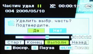 При записи в различных режимах было подмечено, что при записи на диски DVD-RW в режиме VR (см. таблицу) остановка записи происходит не сразу по нажатию кнопки, а с некоторой задержкой, от 3 до 5 секунд. Вызвано это, видимо, тем, что камера какое-то время производит внутренние операции, создавая индексные файлы, которые впоследствии могут быть использованы для редактирования записей средствами самой камеры. Предназначенный для этого встроенный редактор если и заслуживает упоминания, то лишь вскользь. Это и не редактор вовсе, а несложный инструмент, с помощью которого можно вырезать ненужные или неудачно снятые сцены.