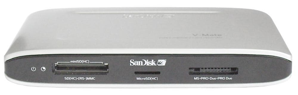 С лицевой стороны аппарат ни дать ни взять обыкновенный картридер во внешнем исполнении (собственно говоря, при подключении устройства к ПК по USB пользователь получает самый что ни на есть обыкновенный картридер). Судя по маркировке, устройство поддерживает работу со следующими типами карт: miniSD(HC); SD(HC) MMC; MicroSD(HC); MS-PRO-Duo-PRO Duo. Что-ж, полный комплект.