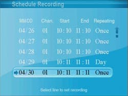 Планировщик записи может содержать до 30 строк (задач), при этом каждую из них можно заставить повторяться ежедневно или еженедельно.