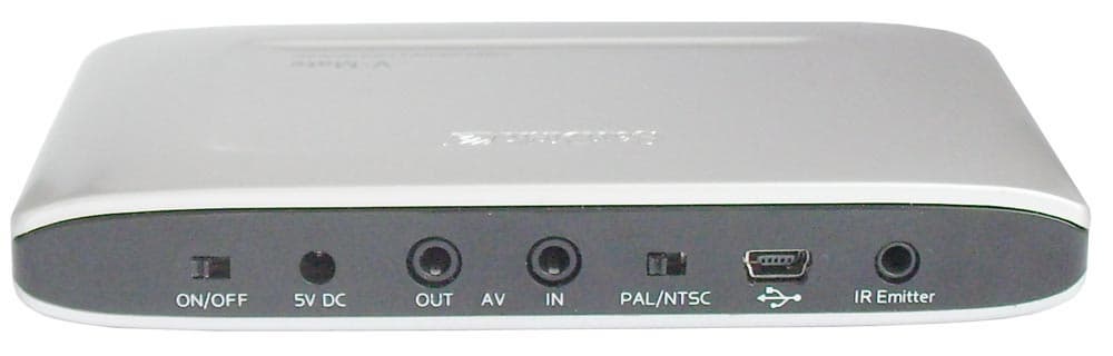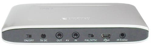 На обратной стороне устройства расположено множество переключателей и разъемов: переключатель включения/выключения устройства, вход для питания, аудио-видео выход и аудио-видео-вход, переключатель ТВ-стандарта (PAL/NTSC), разъем miniUSB, и гнездо для подключения ИК-эмиттера.