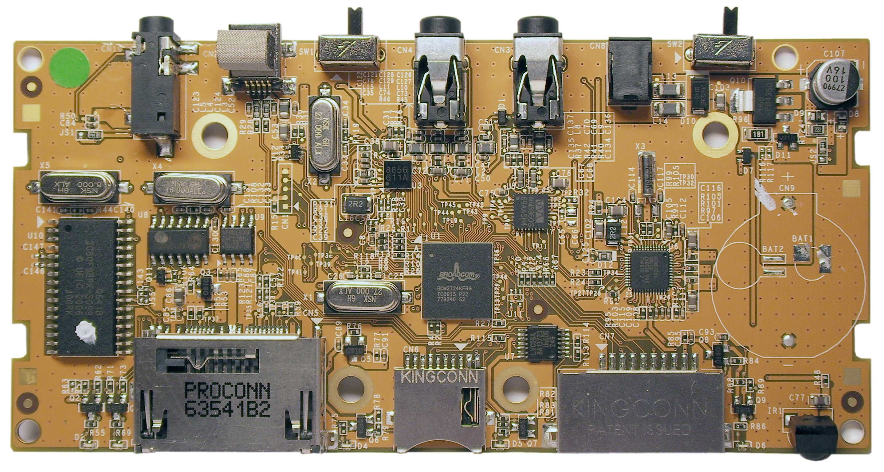 В самом центре платы "сердце" аппарата. Процессор BCM2724, разработанный компанией Broadcom это многофункциональное устройство, много на что способное. При относительно небольшом уровне потребления энергии этот чип отвечает за проигрывание видео в формате MPEG-4, а также за NTSC/PAL аудио-видеовыходы. Помимо этого он умеет обрабатывать 2D- и 3D-графику и оптимизирован для работы с Open VG 1.0 и Open GL ES 1.1/2. Скорость его работы в 3D впечатляет: до 32 млн. треугольников в секунду (для сравнения, графический процессор Sony PSP способен обрабатывать до 33 млн. треугольников в секунду).