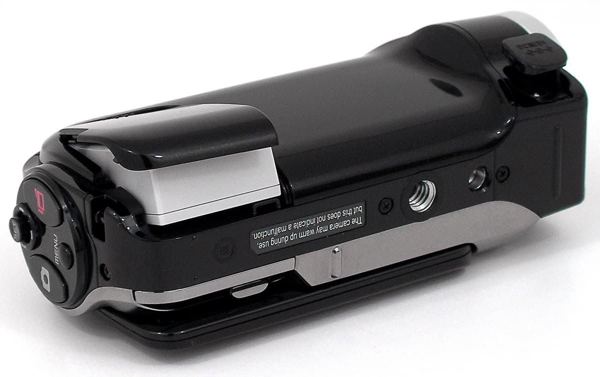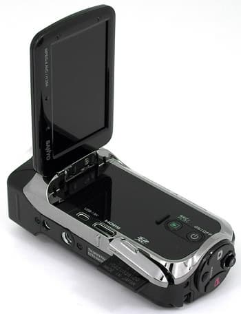 Под откидывающимся ЖК-экраном на корпусе камеры расположены кнопка смены режимов работы и кнопка принудительного включения/отключения аппарата. Ниже имеются ничем не прикрытые интерфейсы: универсальный порт, работающий в качестве USB, а заодно и композитного аудио/видеовыхода (используется разъём micro-USB). Чуть правее — выход HDMI (mini).