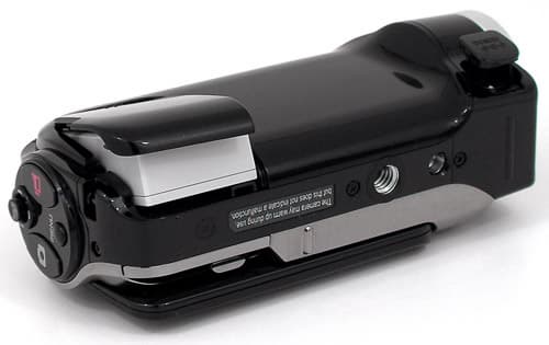 Ниже объектива, который ничем не защищён (нащёлкивающаяся пластмассовая крышечка прилагается), имеется встроенная фотовспышка. Стереомикрофоны скрываются в корпусе откидного ЖК-экрана под небольшими отверстиями.
