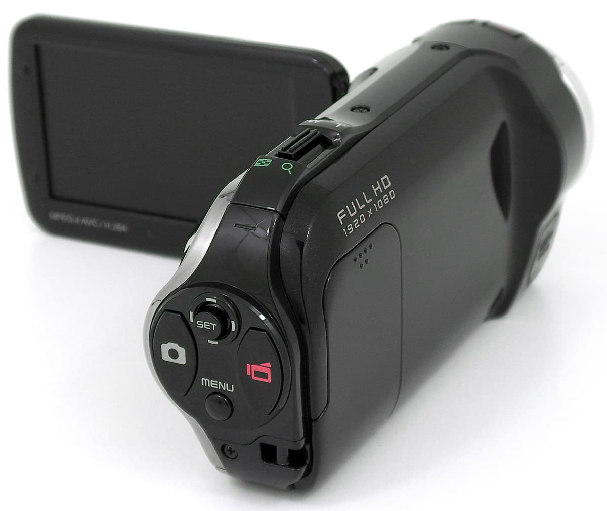 C торца видеокамеры на оператора глядят кнопки Фото и Видеозапись, пятипозиционный джойстик, используемый для навигации по меню, и кнопка Menu, запускающая настройки камеры. Пониже справа расположено ушко для крепления прилагающегося ремешка.