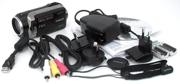 Комплект видеокамеры состоит из ремешка, пластмассовой крышки объектива с ремешком, композитного аудио/видеокабеля, кабеля USB, адаптера переменного тока с переходниками под разные типы розеток, ферритового сердечника для AV-интерфейса, руководства и компакт-диска с полным вариантом инструкции в PDF-формате и программным обеспечением.