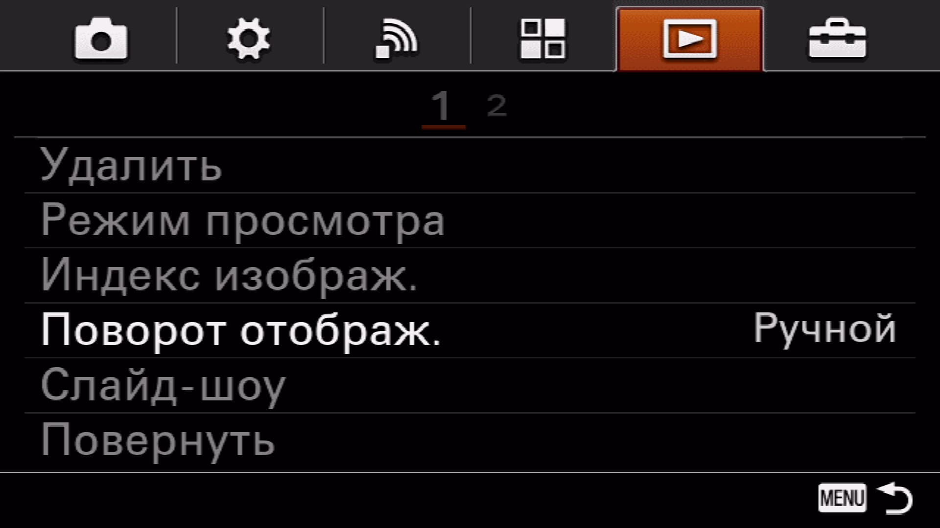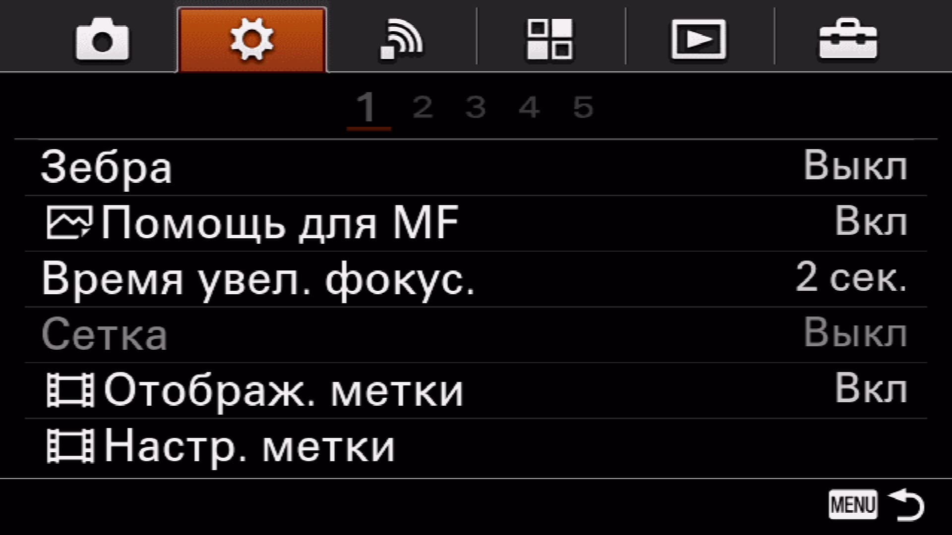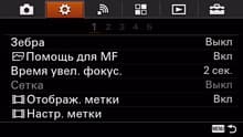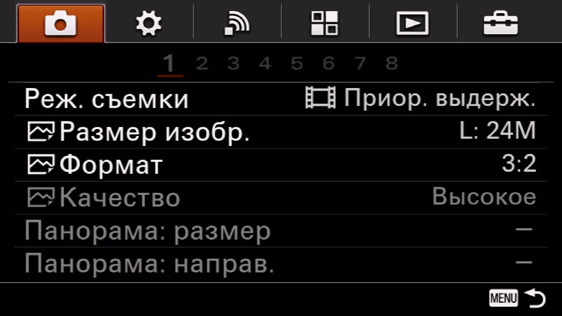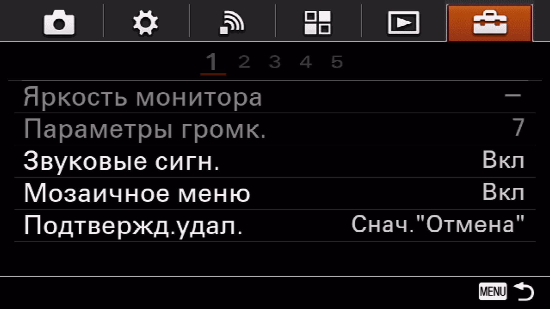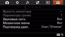 Меню камеры имеет плиточную стартовую страницу. Каждая плитка ведет к соответствующему разделу, который, в свою очередь, разбит на странички-вкладки с параметрами. Казалось бы — ну что мешает включить возможность тач-управления при навигации по этому служебному меню? Дисплей-то у камеры вполне для этого подходит, сенсорный. Однако нет — управление производится только кнопками на корпусе аппарата.