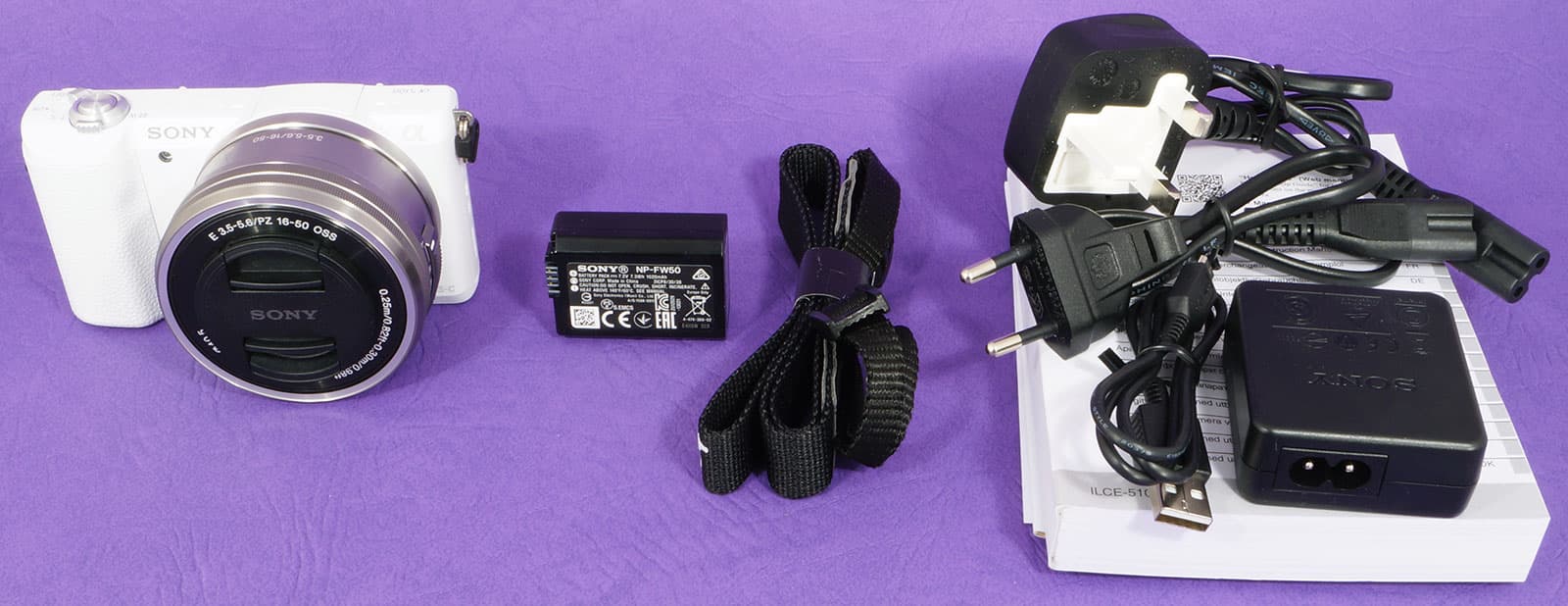 Комплект состоит из камеры, объектива, аккумулятора, ремешка, USB-кабеля и сетевого адаптера питания с переходниками под разные типы розеток.