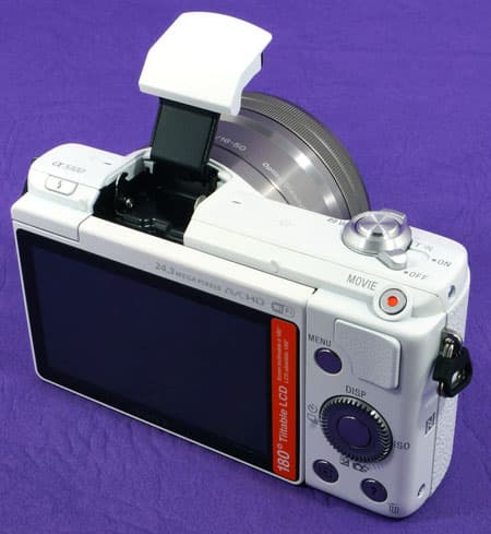 Выскакивающая вспышка-чертик держится на хлипкой с виду ножке; также сверху расположен переключатель питания и рычажок зума, глядящий вперед. Кнопка старта видеозаписи утоплена в корпус — без привычки ее невозможно нащупать вслепую, если вы по профессии не часовщик.