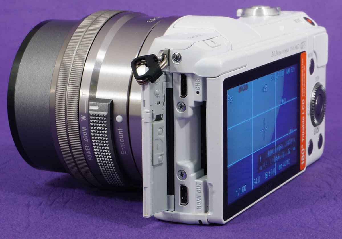 Площадь одной из боковых сторон корпуса аппарата занимает откидывающаяся дверца, под которой расположены USB-порт, видеовыход Micro-HDMI и слот для карты памяти.