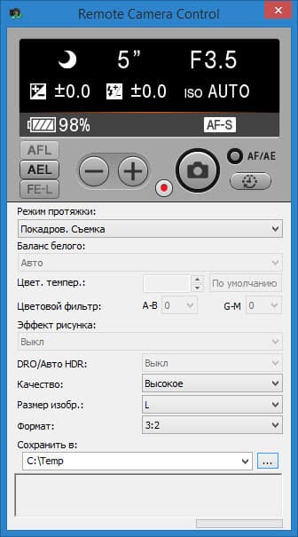 Радует, что камерой можно управлять с компьютера непосредственно по USB: для этого потребуется установить на ПК программу Remote Camera Control.