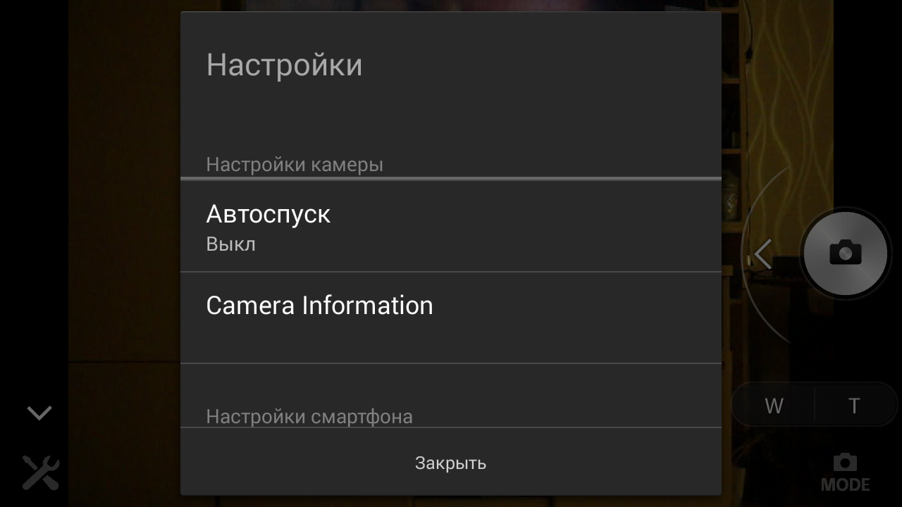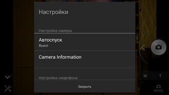 Приложение имеет скромный набор настроек, которые позволяют изменить лишь несколько ключевых параметров камеры. Данные параметры выводятся поверх живой картинки, которая поступает с аппарата — это почти копия «умолчального» Android-приложения Камера.