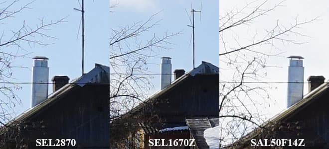 Странно, фотографии не показывают этой трагической разницы. Детализация у всех трех объективов одинаково хороша, видимых потерь не имеется. Так в чем же дело? А вот в чем: с объективом №2 камера не способна делать фотографии того же размера, которые допускаются при использовании первого и третьего объективов (10 Мп против 24 Мп). Следовательно, с данным объективом должен включаться иной алгоритм пересчета кадра в Full HD видео. И алгоритм этот, как мы видим, нельзя назвать высококачественным. Как ехидно подметил коллега автора, «это сделано для того, чтобы, если ты разбил все полнокадровые объективы, то мог бы воспользоваться и полукадровым». Хотя не исключен и вариант недоработанной микропрограммы объектива: текущая прошивка тестировавшегося SEL1670Z имеет версию 01, что наводит на некоторые мысли.