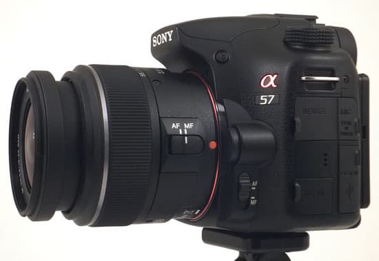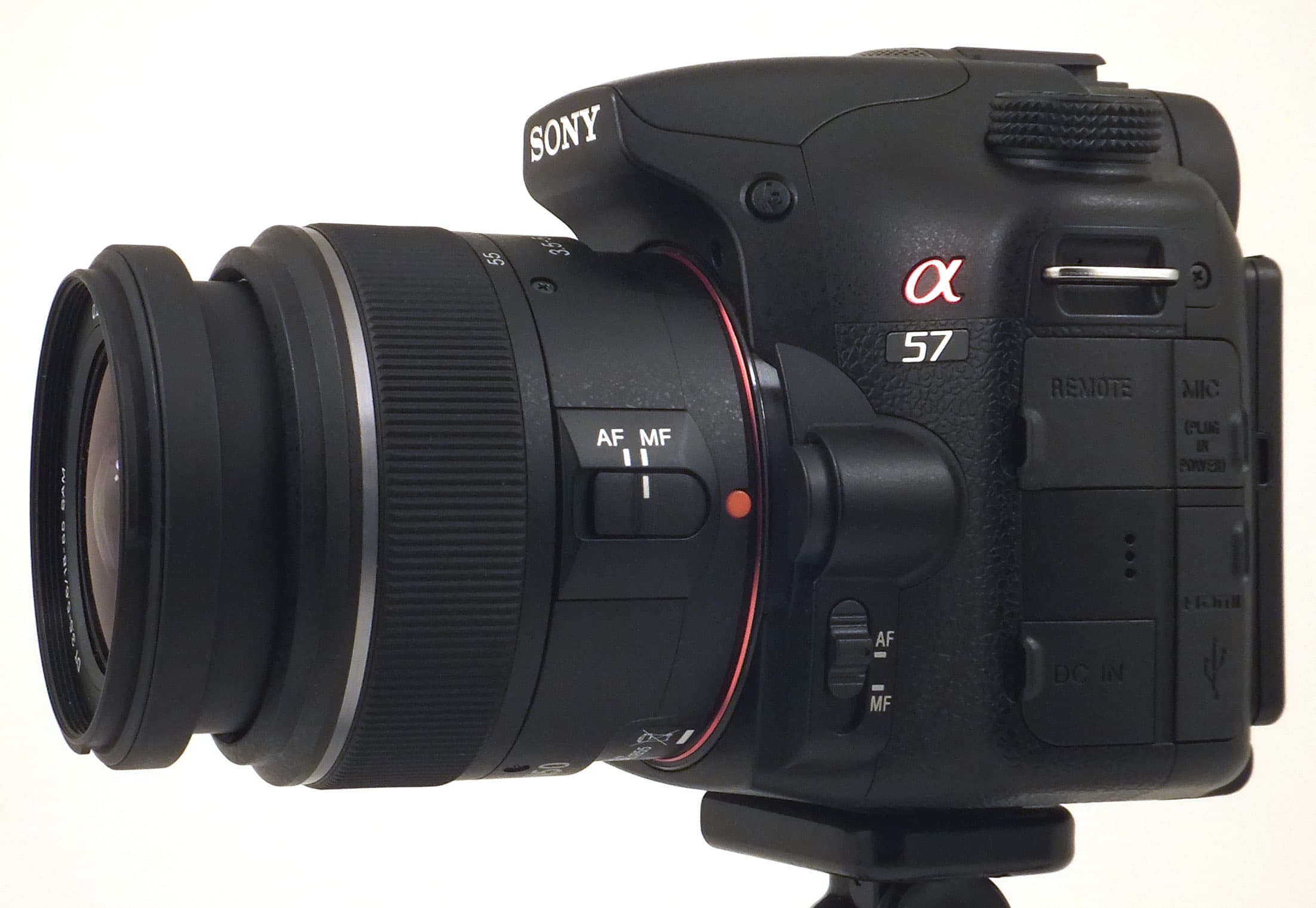 Слот для карты памяти находится на правой грани корпуса фотоаппарата. Такое расположение позволяет быстро заменить заполненную карту новой, чистой. Крышка отсека аккумулятора находится довольно далеко от резьбового отверстия для крепления камеры к штативу, что дает возможность заменить батарею, не снимая камеру со штатива. Впрочем, иногда батарея оказывается и вовсе не нужна, ведь в данном фотоаппарате имеется вход сетевого адаптера питания! Это довольно редкий случай в фотоаппаратной среде, тогда как любая видеокамера в обязательном порядке имеет такой вход, позволяющий камере работать напрямую от сети, не зависеть от быстрорасходуемых батареек. Кстати говоря, наличие такого входа на 90% определило выбор камеры — проще говоря, Sony SLT-A57 была приобретена в первую очередь по причине наличия входа питания для последующей работы в стационарных условиях, когда с питанием нет никаких проблем.