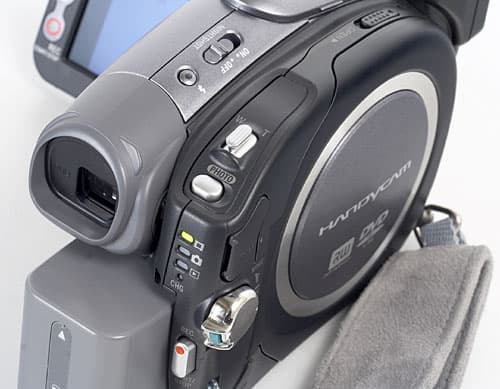 Камера очень удобно располагается в руке средних размеров, все кнопки (Трансфокатор, Фото, Запись, Питание), необходимые для управления камерой при съемке, расположены под большим и указательным пальцами. Видоискатель выдвигается всего лишь на пару сантиметров, но такого расстояния вполне достаточно, чтобы выступающий аккумулятор не мешал работе. Справа от видоискателя расположены в ряд три индикатора текущего состояния камеры: Фото, Видео, Проигрывание, а чуть ниже находится светодиод, сигнализирующий о подключенном зарядном устройстве.