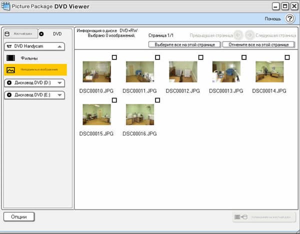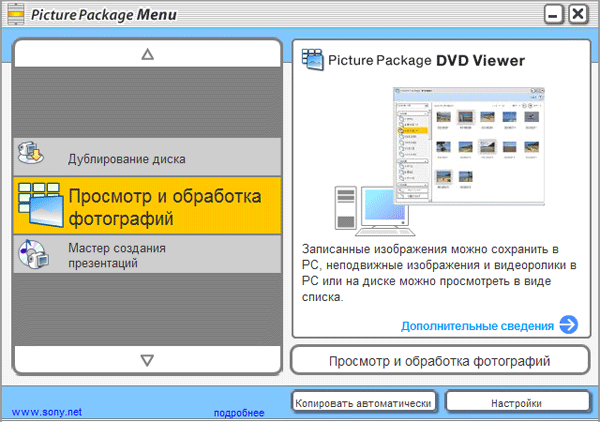 Для работы с отснятым материалом к камере прилагается программа Picture Package. После установки на компьютер она берет на себя функцию управления камерой, отныне все действия можно производить непосредственно в этой программе.
