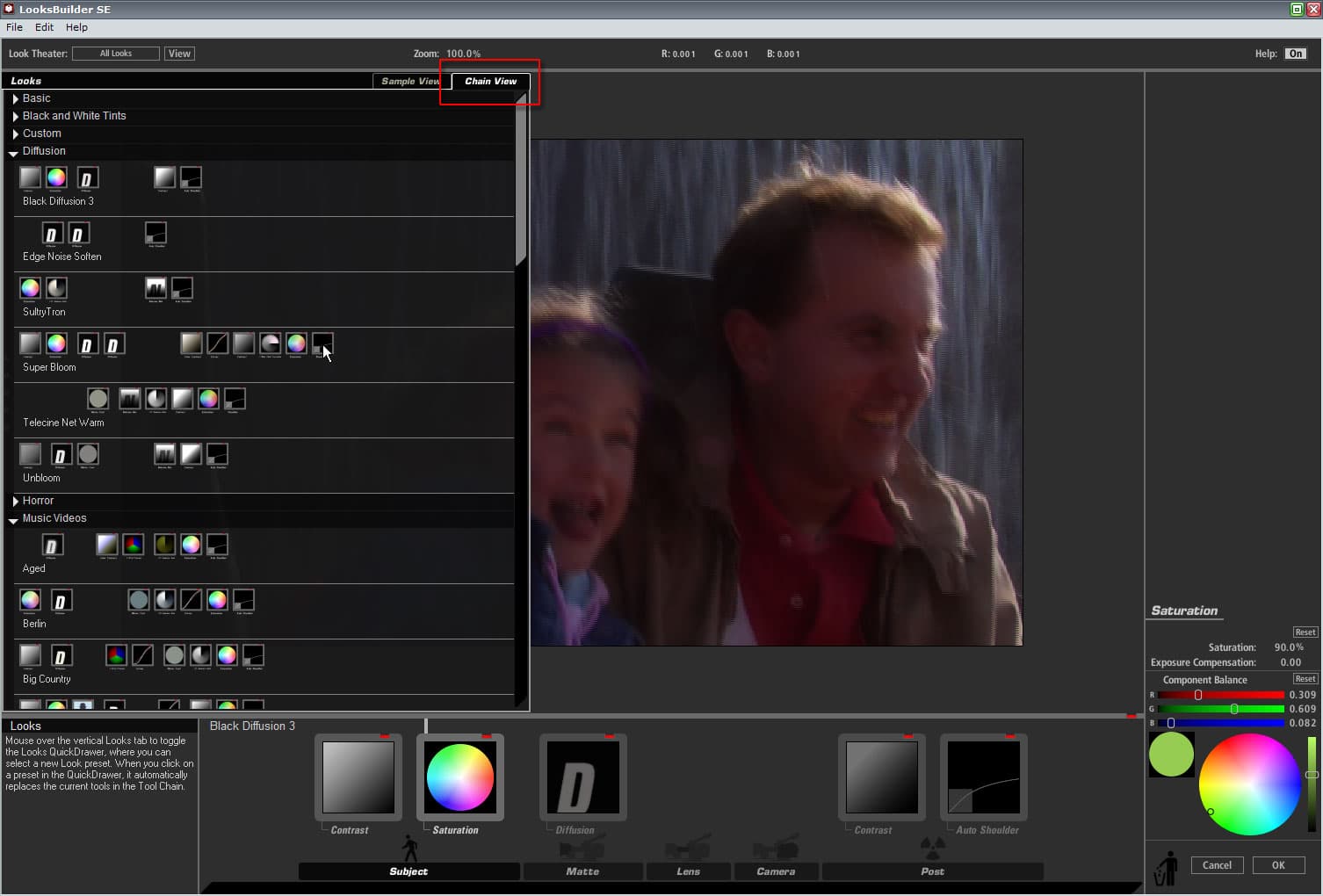 Если же выбрать иное отображение списка шаблонов, щелкнув по вкладке "Chain View", то в модуле вместо пиктограмм кадра появится цепочка фильтров, которая накладывается на видео. Теперь вы можете вручную изменить значения каждого из фильтров их параметры отображаются в правом нижнем углу программного окна.