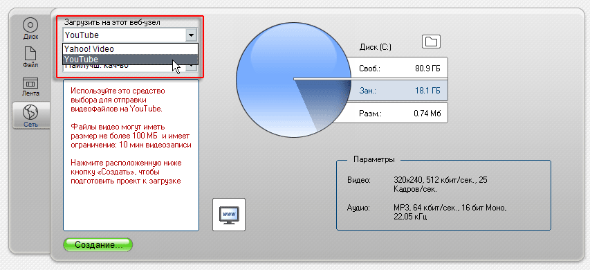 Кроме подготовки собственно роликов, программа еще и загружает их самостоятельно на выбранный пользователем сервис. Конечно же, для этого нужно иметь учетную запись на YoyTube или Yahoo!Video. Впрочем, зарегистрировать новый аккаунт можно, щелкнув по соответствующей строке модуля: