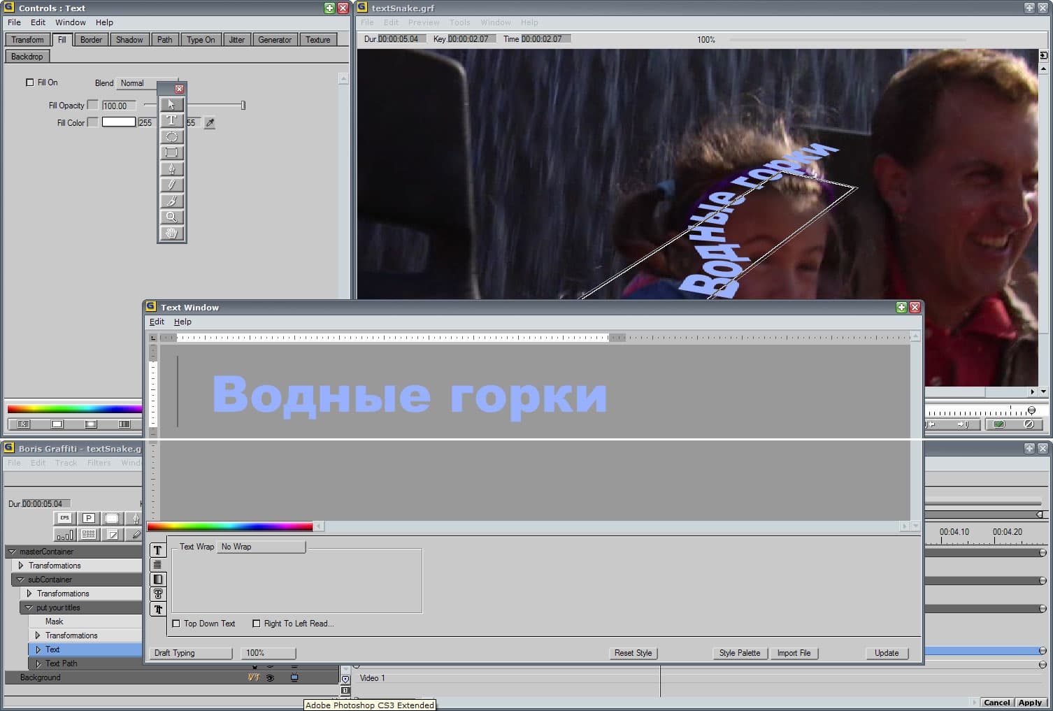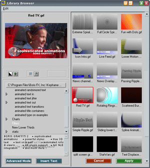 Boris Graffiti предназначен в основном для создания профессиональных титров и заставок. Почему "профессиональных"? Достаточно лишь одного взгляда даже на графические шаблоны, встроенные в этот модуль, чтобы представить себе результат работы с Graffiti. А уж если внимательно изучить скриптообразные предустановки движения титров, их появления или исчезновения...