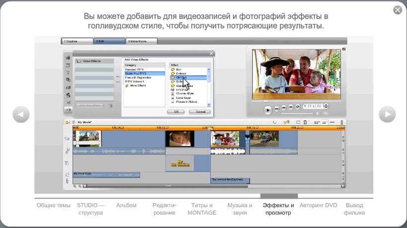 Этот проект состоит из последовательности видеофайлов, фотографий, музыкальных клипов и титров, обильно сдобренный эффектами и переходами. Если внимательно проанализировать каждый элемент, находящийся на таймлинии, даже новичок сходу разберется в общих принципах монтажа.