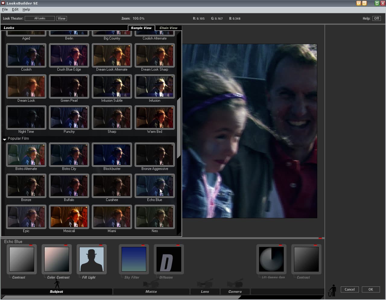 Особенно поражает и изумляет скорость работы LooksBuilder-а. Выше всяческих похвал, любое изменение фильтра либо шаблона мгновенно отражается в результирующем окне просмотра. Наглядность, скорость работы, азбучность интерфейса три главных плюса LooksBuilder. Ну а видео, обработанное этим плагином, выглядит просто великолепно:
