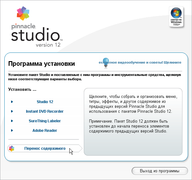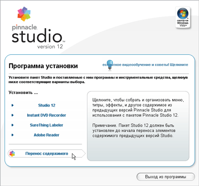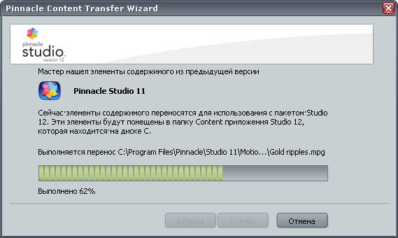 Данный модуль активируется нажатием соответствующей кнопки в программе установки. Его работа заключается в поиске элементов содержимого из предыдущих версий Studio: меню DVD-дисков, титров, переходов, эффектов, звуков, комплектов Premium Pack, RTFx и Hollywood FX, а также элементов содержимого, приобретенных и активированных пользователем через Интернет.