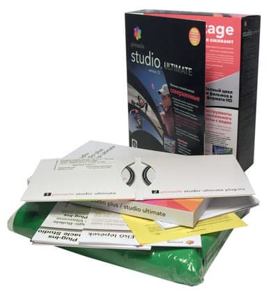 Увесистая коробка содержит два диска (DVD c дистрибутивом программы и CD с плагинами), 370-страничную инструкцию на русском языке, мультиязычные листовки по использованию плагинов и зеленое полотно размером два на полтора метра (см. статью Pinnacle MovieBox Plus USB).