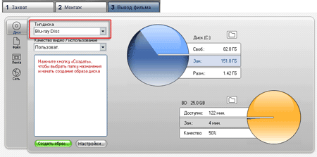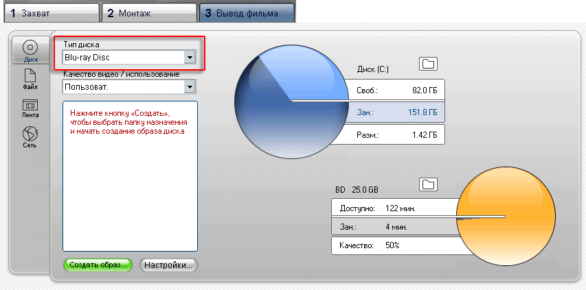 На вкладке "Вывод фильма" выберем опцию создания Blu-ray диска (без прожига, всего лишь создание образа диска в выбранной папке), и нажмем "Создать образ".