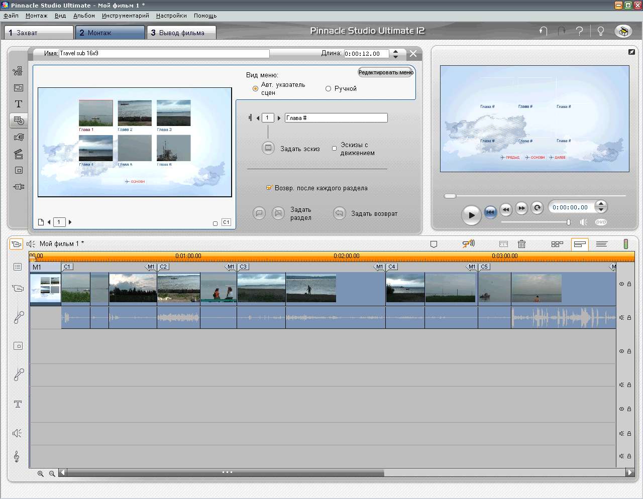 Создадим простенький проект, добавив к фильму анимированное меню. Никаких дополнительных эффектов к видео мы намеренно не добавляли, что поможет нам проверить способность программы выводить AVCHD видео без его перекодирования.