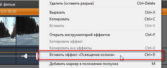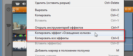 Достаточно щёлкнуть правой кнопкой мыши по клипу, которому уже присвоены какие-либо эффекты, и выбрать из выпадающего меню нужный пункт. Впоследствии скопированный эффект (эффекты) можно добавить любому клипу (клипам) через ту же правую кнопку мыши.