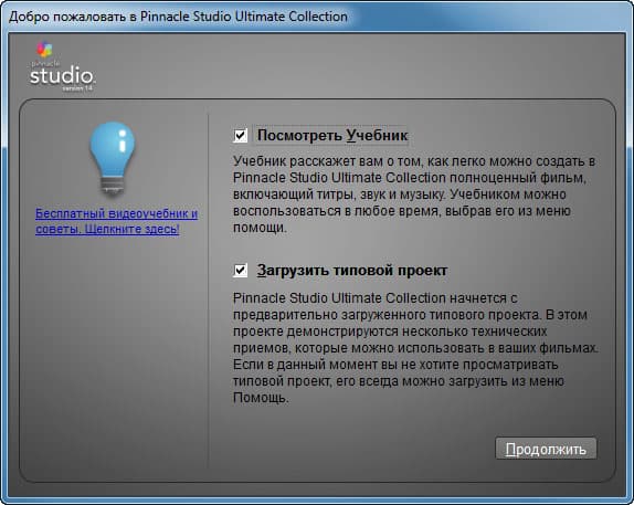 При первом запуске программы предлагается запустить краткий учебник или же загрузить типовой проект, состоящий из демонстрационных роликов.